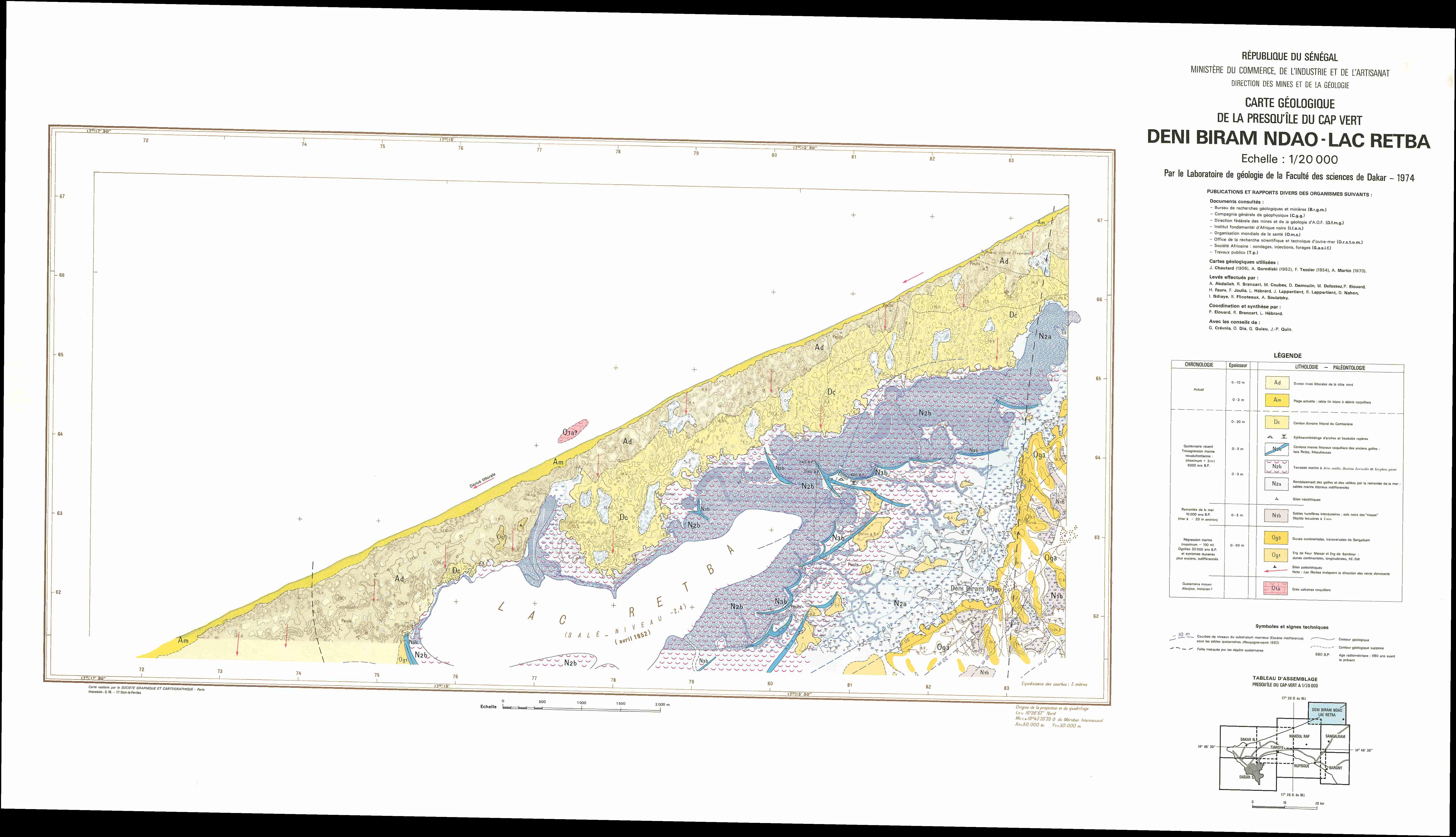 Carte géologique de la presqu'île du Cap-Vert, Feuille de Deni Biram Ndao - Lac Retba / Brancart R. (1974)